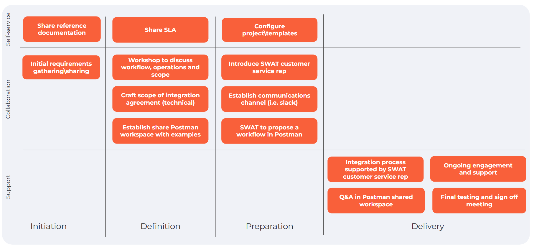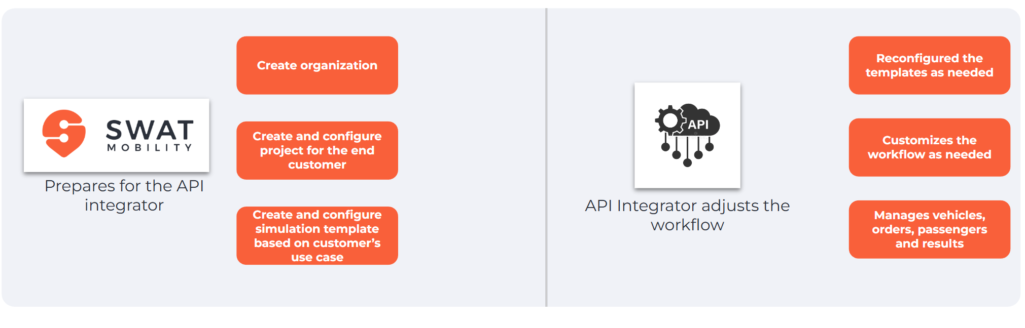templates is typically a demanding task that requires an in-depth understanding of the end customer's operations. This is because there are numerous parameters and configurations that need to be appropriately adjusted for the system to generate operationally feasible and efficient routes. This also includes setting up time-dependent and customer-editable maps, as well as (routing API)[/docs/manuals/routing.md]. While an API consumer can execute these actions through SWAT Integration APIs, we strongly advise that the SWAT team handle the initial configuration, while the API consumer can make the necessary adjustments.In the diagram below, typical milestones are shown. Although not every step is implemented for each integration project, we aim to provide a smooth experience by dedicating attention to each partner.