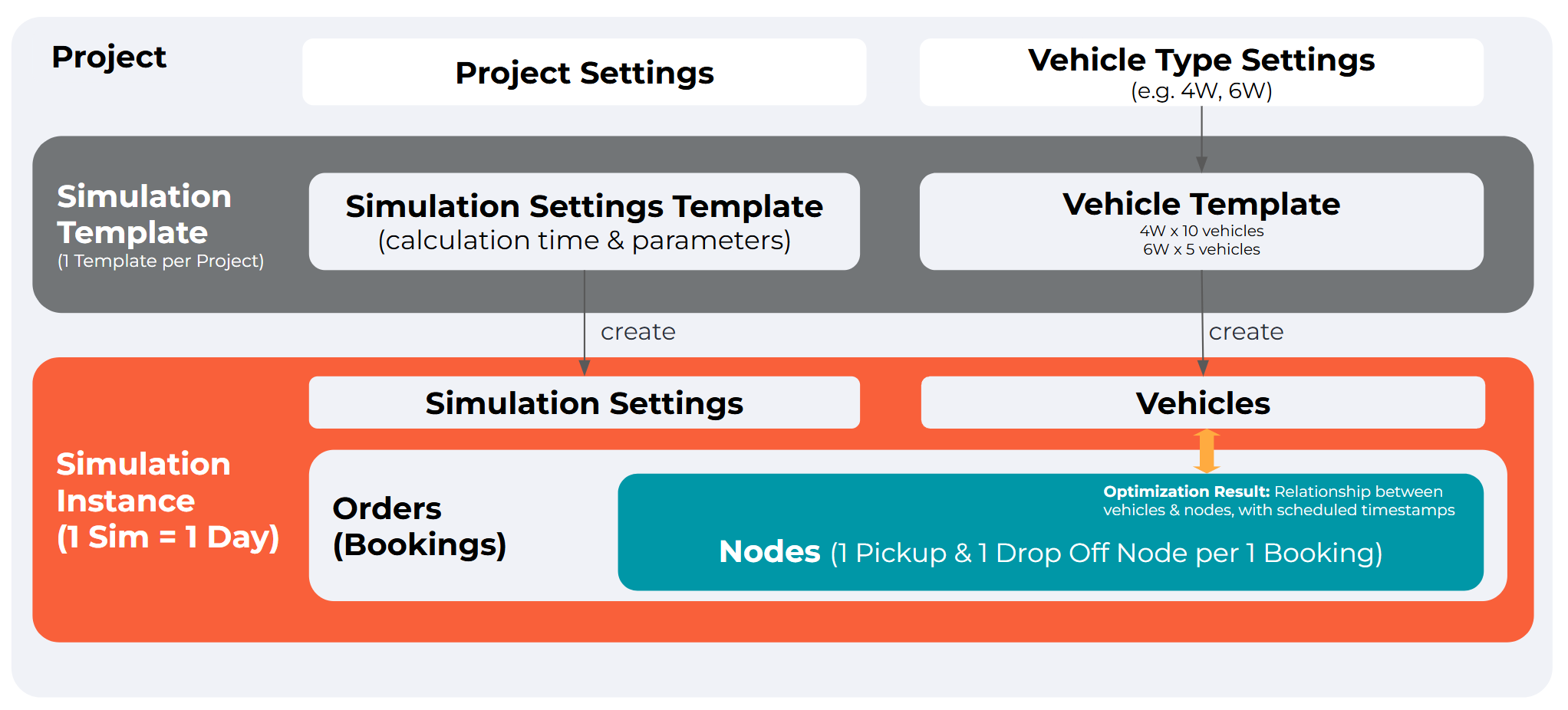 for a project such as settings, fleet configuration, predefined routes etc. These settings are applied by default on each simulation creation for a project. Multiple templates are supported per project and can be used in recurring situations (i.e. one template for Sundays, another template for Mondays) -