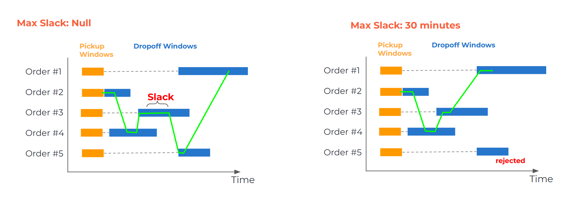You can try out the Vehicle Slack concept using the playground below. You can try out the Vehicle Slack concept using the playground below. In this example, the vehicle performs a series of pickups and drop-offs. The drop-off time windows are spaced out such that the vehicle is forced to wait (incur slack) between some of the stops, demonstrating how time window constraints can lead to unavoidable idle time.