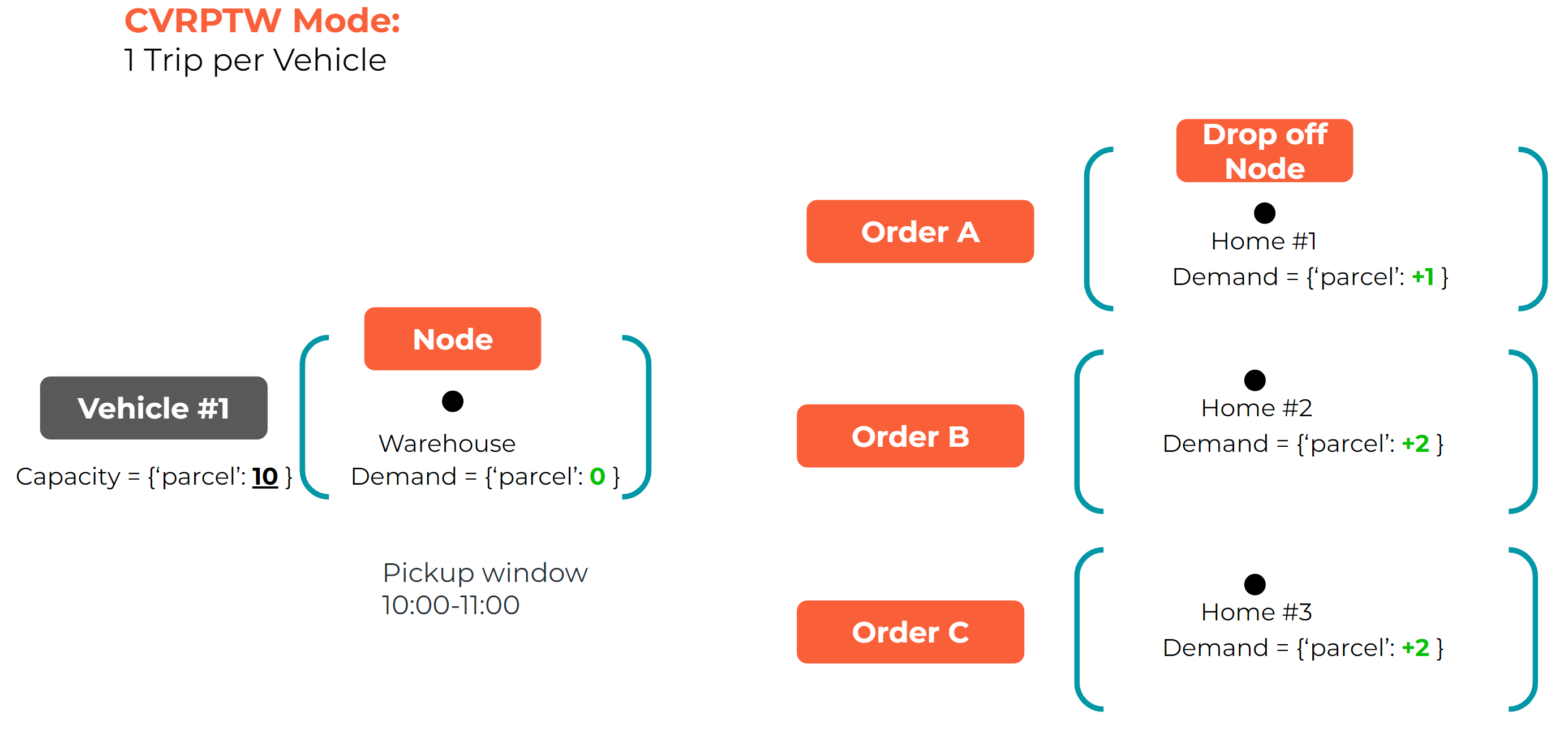 ステートレスAPIは、CVRPTW問題を解決するために使用されるprebook_cvrptwモードと、VRPPDTW問題を解決するためのprebookモードの2つのモードをサポートしています。 CVRPTWモードは、ピックアップポイント/DC/倉庫が1つしかないシナリオにのみ適しています。このモードでは、すべてのピックアップノードが結合され、ノード数が大幅に削減され、結果が大幅に向上します。ピックアップノードが結合されているため、各車両は最大1回のトリップ(または1回のピックアップ)に制限されます。このモードは、1回のピックアップと1回のドロップオフの両方のケース(つまり、単一のDC/倉庫からの商品の配送、および複数のピックアップ場所から単一のDC/倉庫への商品の収集)をサポートします。